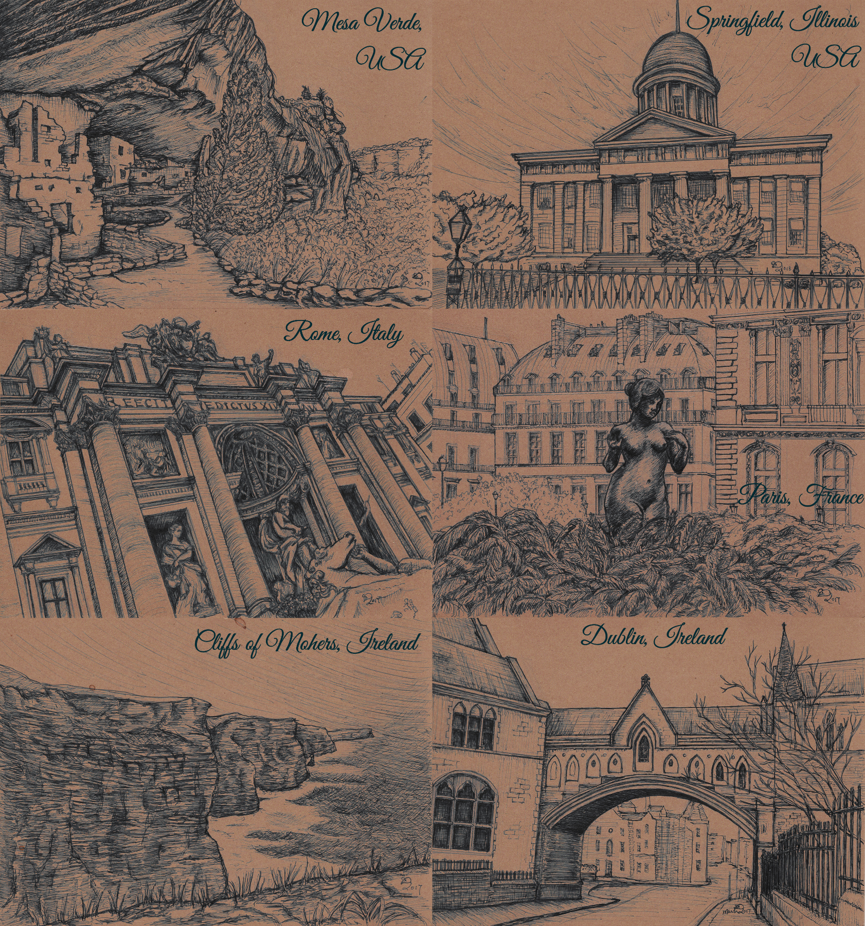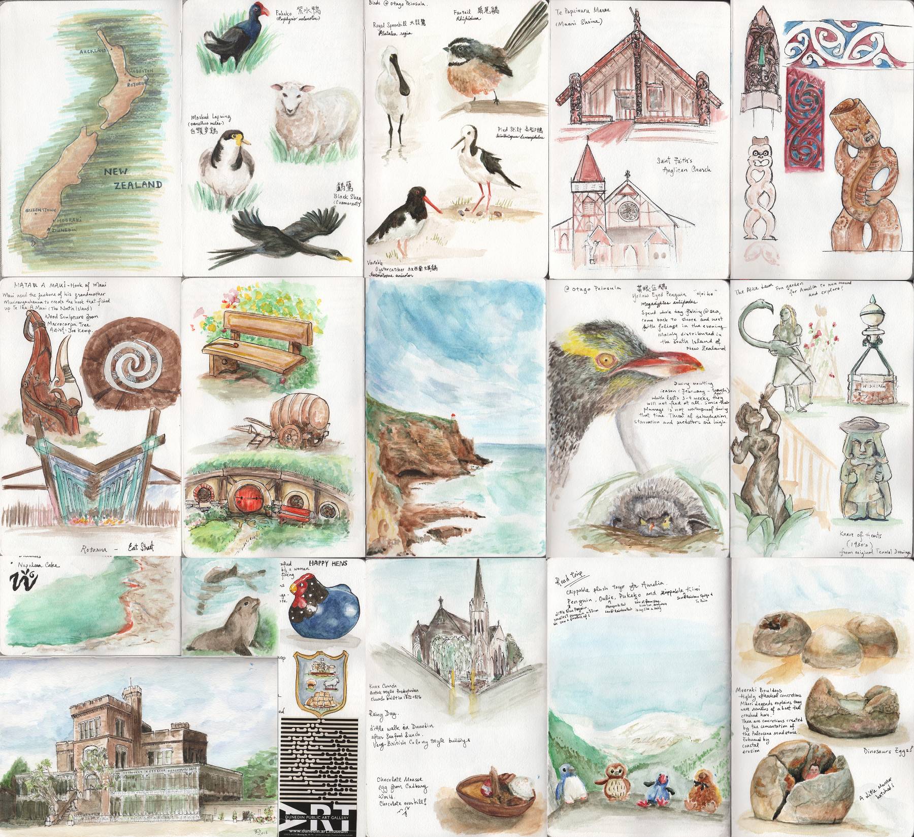 Watercolor & marker travel journal I did during and after (from my photographs) my trip to New Zealand (Rotorua, Hobbiton, Otago Peinsula, Dunedin, Queenstown) last year.